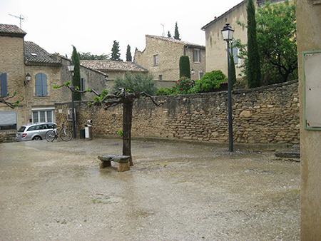 The terrain became hilly and the cycling much more challenging. We also started to feel raindrops. By the time we came to the village Cabrières-d’Avignon it was raining. We ducked in to the covered entrance of an old church to wait out the storm. The storm became a heavy down pour, so we waited for it to pass. The original plan was to cycle to the hilltop town of Gordes before turning around. With the darkening skies we decided to head back to the bike shop.