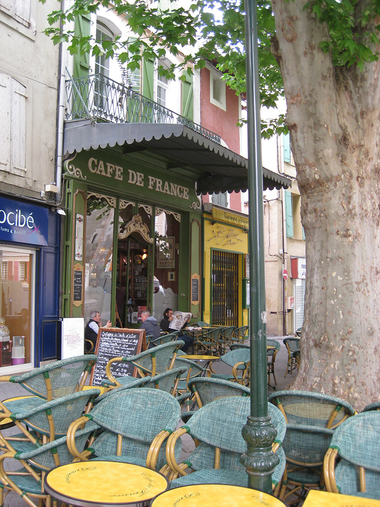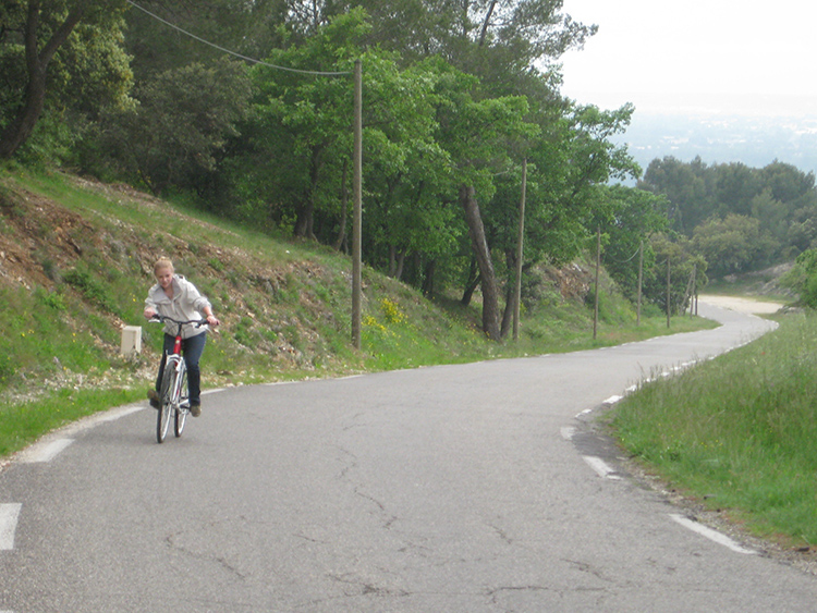 First stop was to fuel up with cappuccino and croissants at the appropriately named Cafe de France. Then we were off. By this time the people of L’Isle sur la Sorgue were awake and out and about, so there was bit of traffic. Once we left the outskirts of town the cycling was quite pleasant.