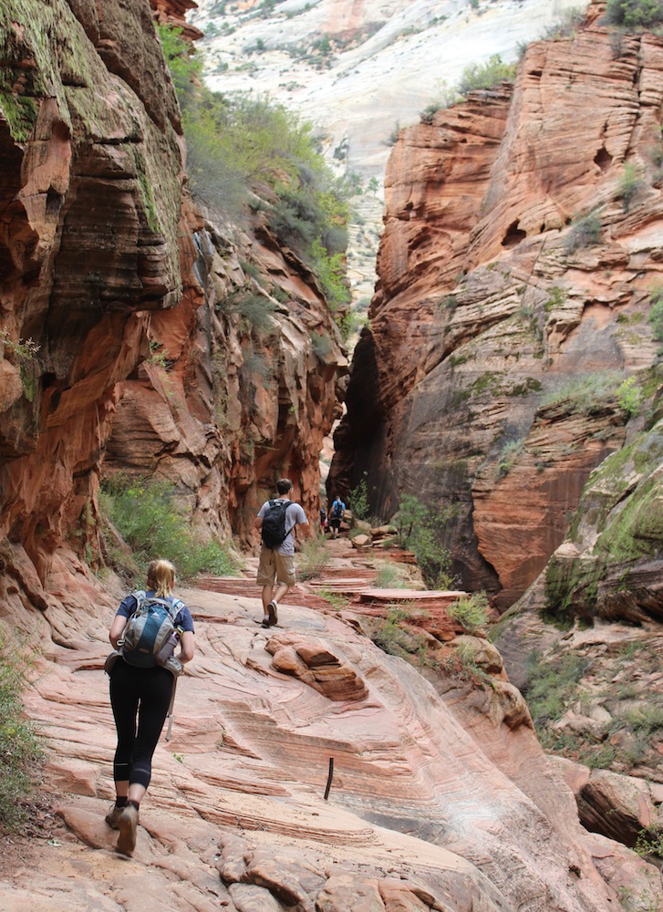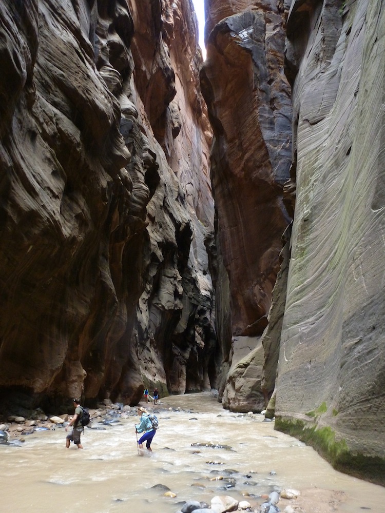 Hiking “The Narrows” was the Zion highlight . A spectacular canyon hike with towering sheer walls rising up on both sides. For most of the hike you are in the cold water of the Virgin river on slippery rocks. It feels strange at first but you quickly get used to hiking in the water. I recommend you rent the Canyoneering water shoes widely available at the local shops. You will also need a trekking pole or walking stick for stability in the water.